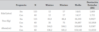 Tabla 1. Distribución de la población según centros sin propuesta y centros con propuesta con referencia a edad, peso, altura.